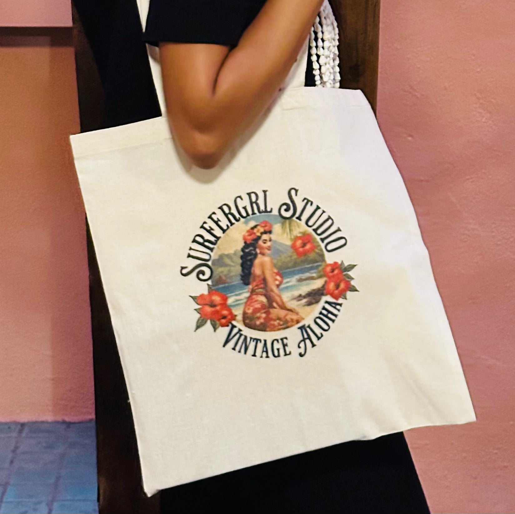 Step back in time with our Vintage Aloha Cotton Tote Bag Collection, inspired by the glamorous travel posters, matchbooks, and menu art of the 1930s and 1940s. Our designs celebrate the elegance of Art Deco, the romance of Waikiki’s boat days, and the playful charm of vintage hula girls, beach boys, and classic surf culture. Using advanced sublimation printing, each design is seamlessly infused into the recycled cotton fabric, delivering vibrant, fade-resistant colors that reflect the beauty and spirit of Hawai‘i.