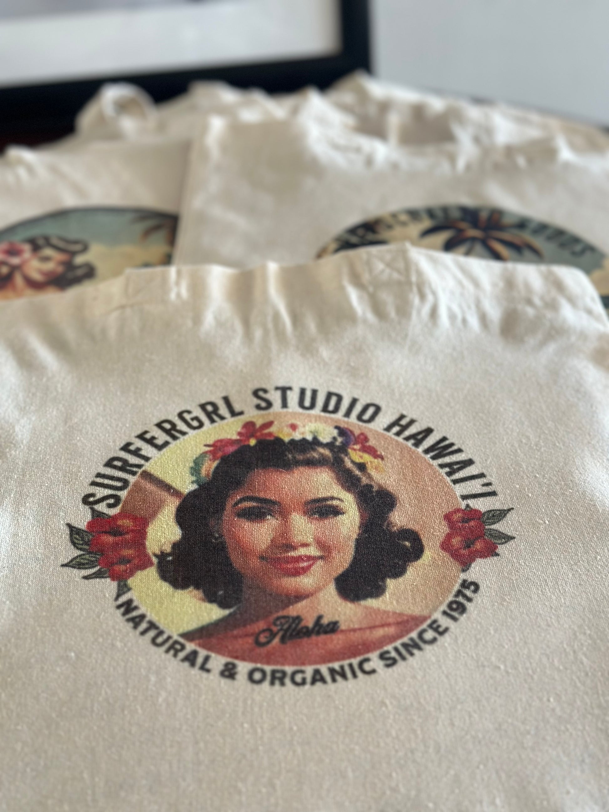 Step back in time with our Vintage Aloha Cotton Tote Bag Collection, inspired by the glamorous travel posters, matchbooks, and menu art of the 1930s and 1940s. Our designs celebrate the elegance of Art Deco, the romance of Waikiki’s boat days, and the playful charm of vintage hula girls, beach boys, and classic surf culture. Using advanced sublimation printing, each design is seamlessly infused into the recycled cotton fabric, delivering vibrant, fade-resistant colors that reflect the beauty and spirit of Hawai‘i.